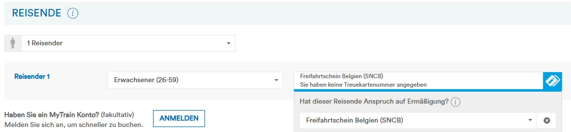 • Freifahrtschein Belgien (SNCB) bzw. 100% Ermäßigung Belgien (SNCB)